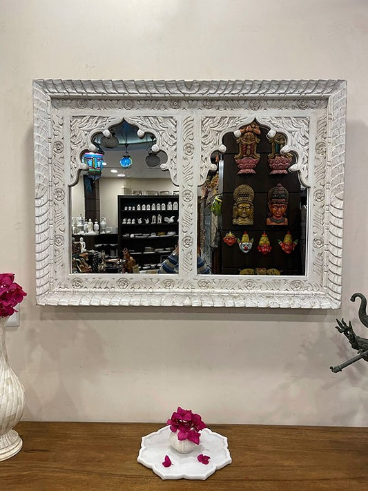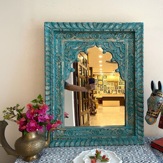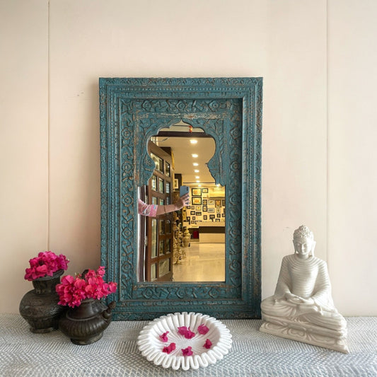 Vintage Hand - Carved Mirror Frame in Solid Wood for Bedroom | Living Room Indian Wall Mirror Jharokha Mirror | Vintage Wall Decor Mirror | Rustic Antique Decor Mirror