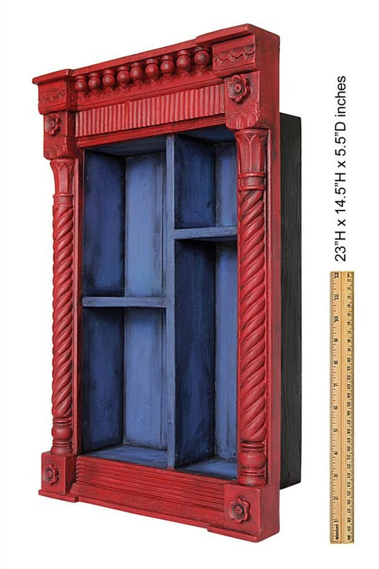 Vintage Red Hand Carved Wooden Wall Shelf Cabinet