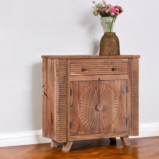 Hand-Carved 90cm Acacia Wood Storage Cabinet – Sunburst Design