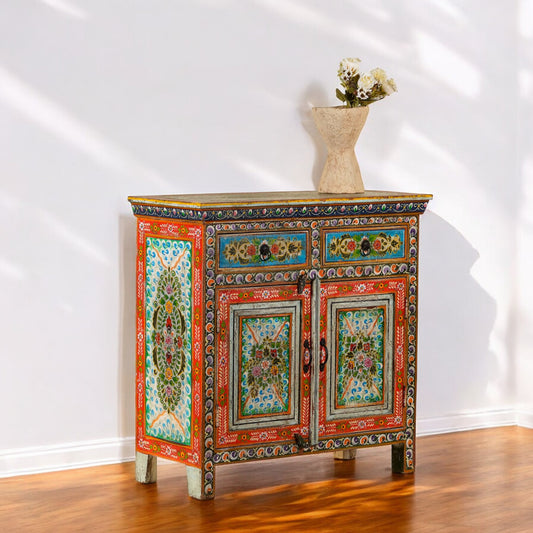 Amoli 90cm Artisan-Painted Cabinet – Recycled Wood Cupboard with Floral Motifs