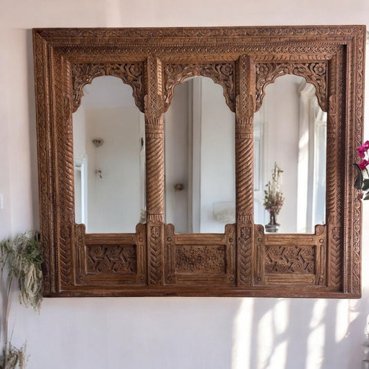 Hand-Carved 3 Jharokha Mirror with Distressed Rustic Wooden Frame | Indian Wall Mirror