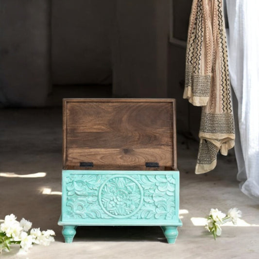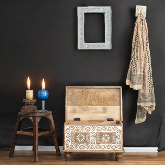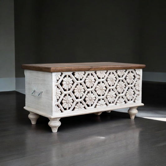 Hand carved wooden storage trunk/chest Distressed white Jhali