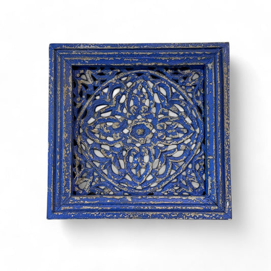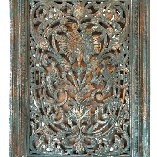 Handmade Vintage Blue Carved Panel | Intricate Floral Wooden Art | Rustic Wall Décor